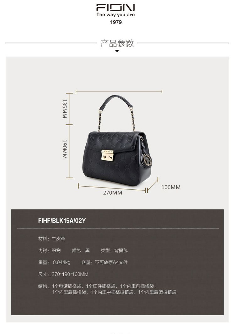 FION女款黑色压花简约手提包